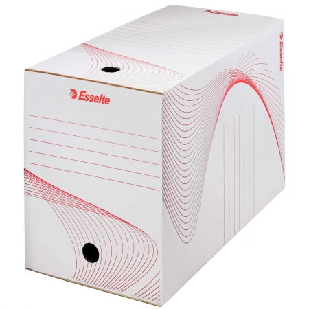 Cutie de arhivare Esselte, 20 cm, carton dublu – Ideala pentru documente A4 in cantitate mare, inclusiv dosare groase sau alonje. Realizata din carton 100% reciclat, certificat FSC. Se poate depozita atat vertical, cat si orizontal, cu posibilitate de inscriptionare pe mai multe laturi. Se asambleaza usor, fiind perfecta pentru arhivare eficienta, sustenabila si de durata.