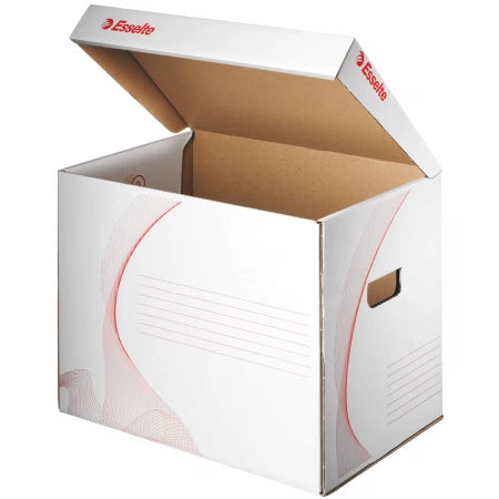 Cutie de arhivare Esselte cu capac rabatabil – Solutie practica si durabila pentru depozitarea si transportul bibliorafturilor, dosarelor si documentelor A4. Realizata din carton dublu, 100% reciclat, certificat FSC, cutia este rezistenta si stabila.