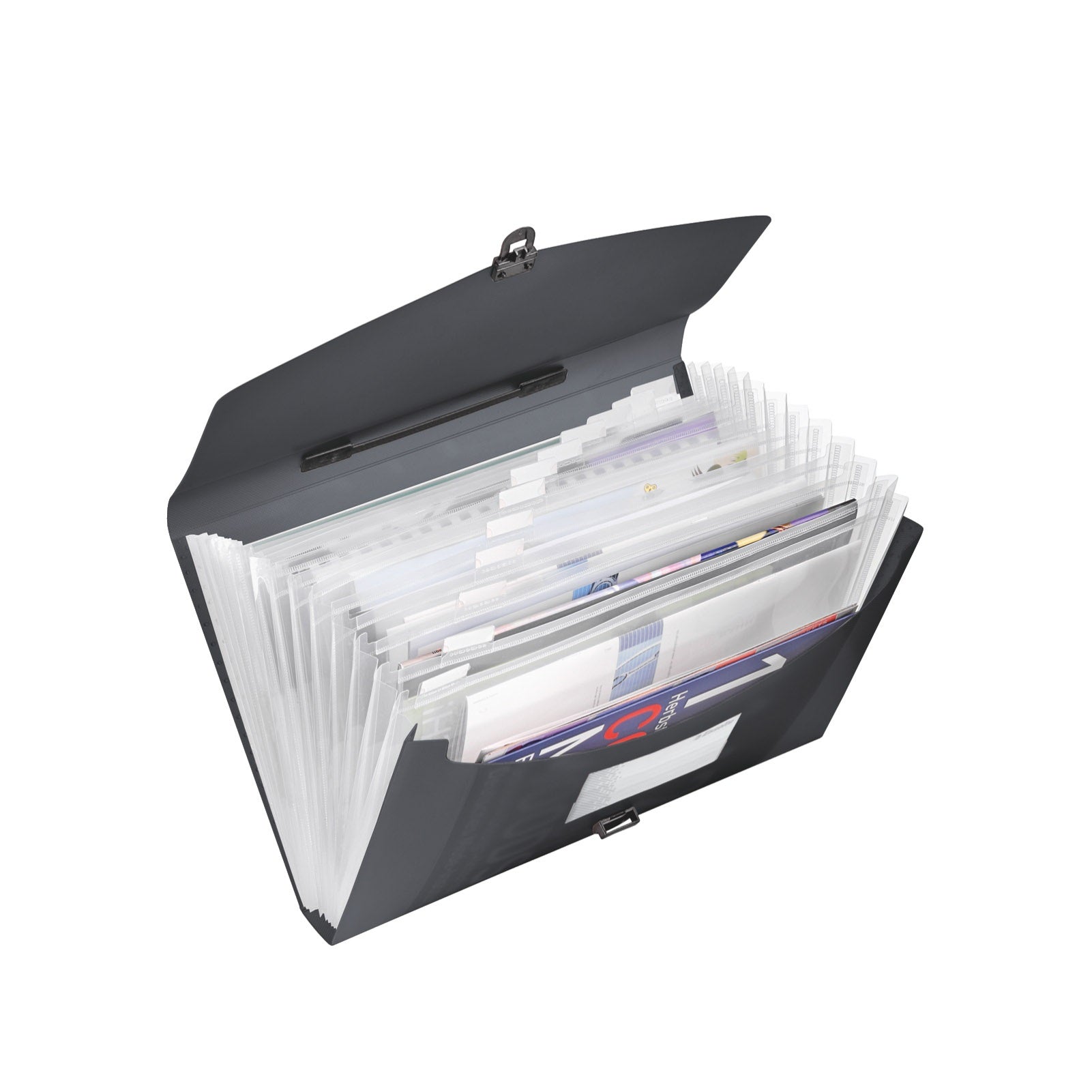Mapa din plastic cu maner si 12 compartimente extensibile, prevazute cu index. Ideala pentru organizarea proiectelor. Confectionata din polipropilena translucida, de 0.67 mm grosime, textura VIVIDA. Inchidere sigura si maner pentru transport facil. Buzunar pentru carte de vizita pe coperta frontala.