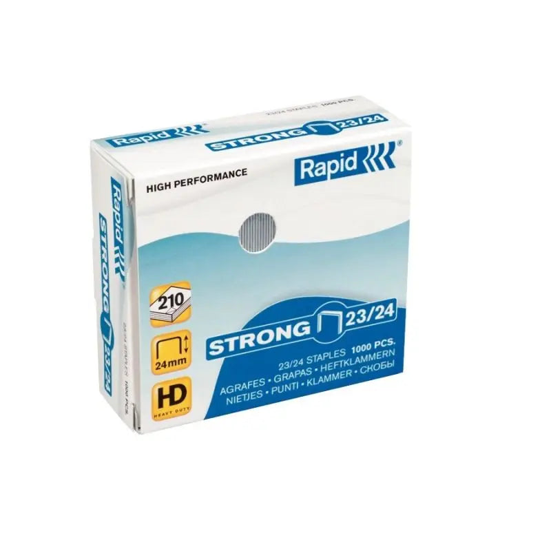 Capse de mare capacitate, din metal puternic si rezistent, pentru capsarea hartiei de scris si colorate. Capseaza intre 150 si 210 coli (80 gr/mp). Simbolul galben pentru a semnala tipul capsei- STRONG. 24 mm lungimea piciorului. Capse zincate din metal puternic pentru cea mai buna performanta. Margini ascutite pentru o mai buna penetrare.