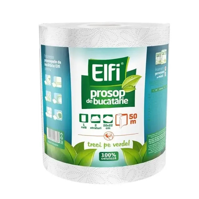 Prosoapele de hartie Elfi sunt puternic absorbante, din hartie rezistenta, foarte utile in bucatarie sau pentru curatarea suprafetelor lavabile. Nu lasa scame, pot fi folosite cu succes pentru curatarea geamurilor, oglinzilor, mobilei si a altor suprafete lavabile (gresie, faianta, blat, masa, vase, etc.). Hartie in doua straturi gofrata din celuloza 100%, rezistenta la apa.